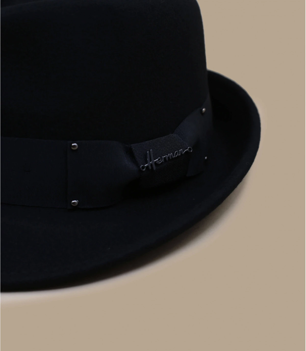 L’élégance du noir et la qualité d’un feutre de laine se combinent dans ce superbe chapeau trilby de la marque spécialisée Herman, relevé d’un large galon ton sur ton noué sur le côté. Un classique qui complètera à merveille vos tenues.