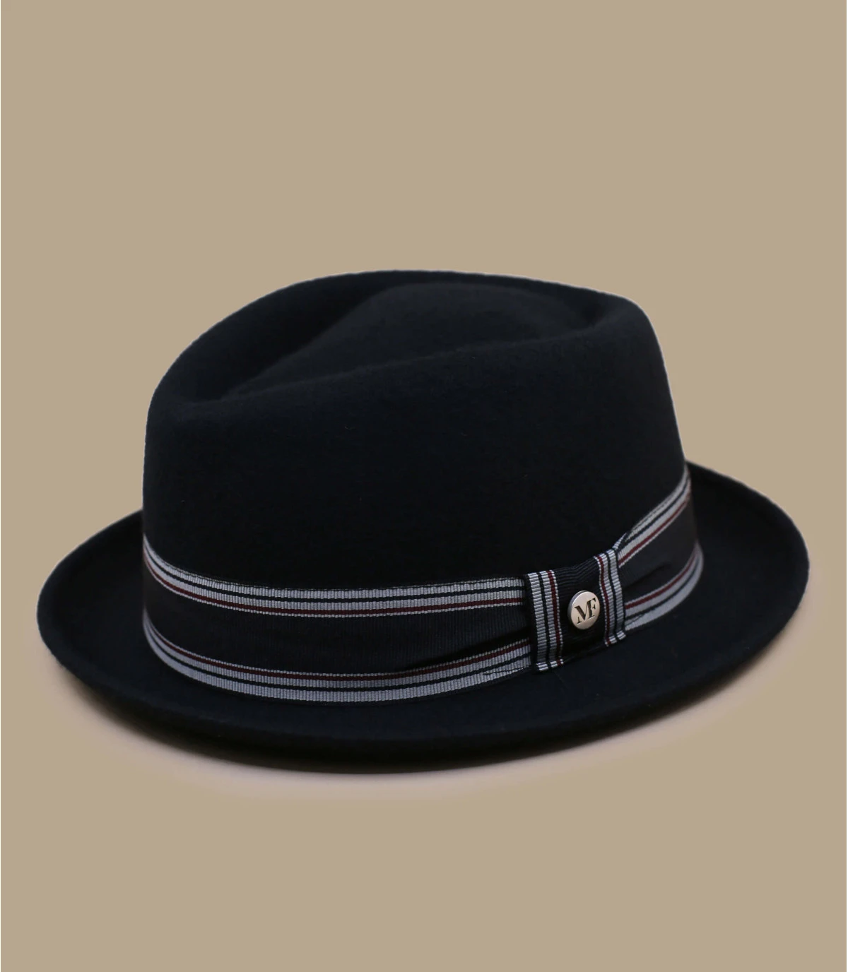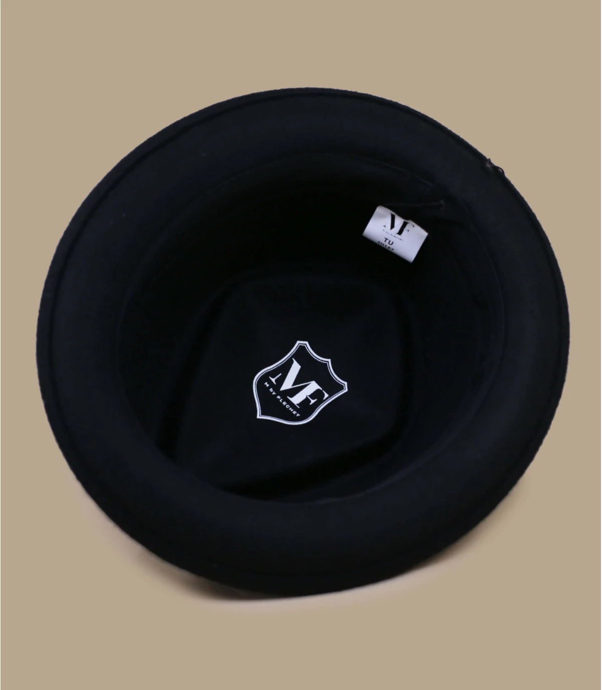 Le chapeau pork pie est à la pointe de la mode avec son côté rétro assumé et ses finitions parfaites. Ce modèle noir est décoré d’un ruban rouge et noir, sur son noeud est visible le logo de la marque.