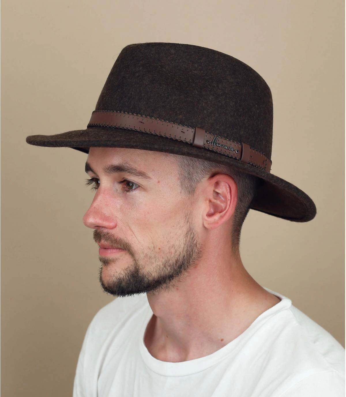 Complétez vos tenues d’une note élégante, avec ce magnifique fédora en feutre de pure laine brun. Proposé par le spécialiste Herman, il est relevé d’un ruban de cuir.