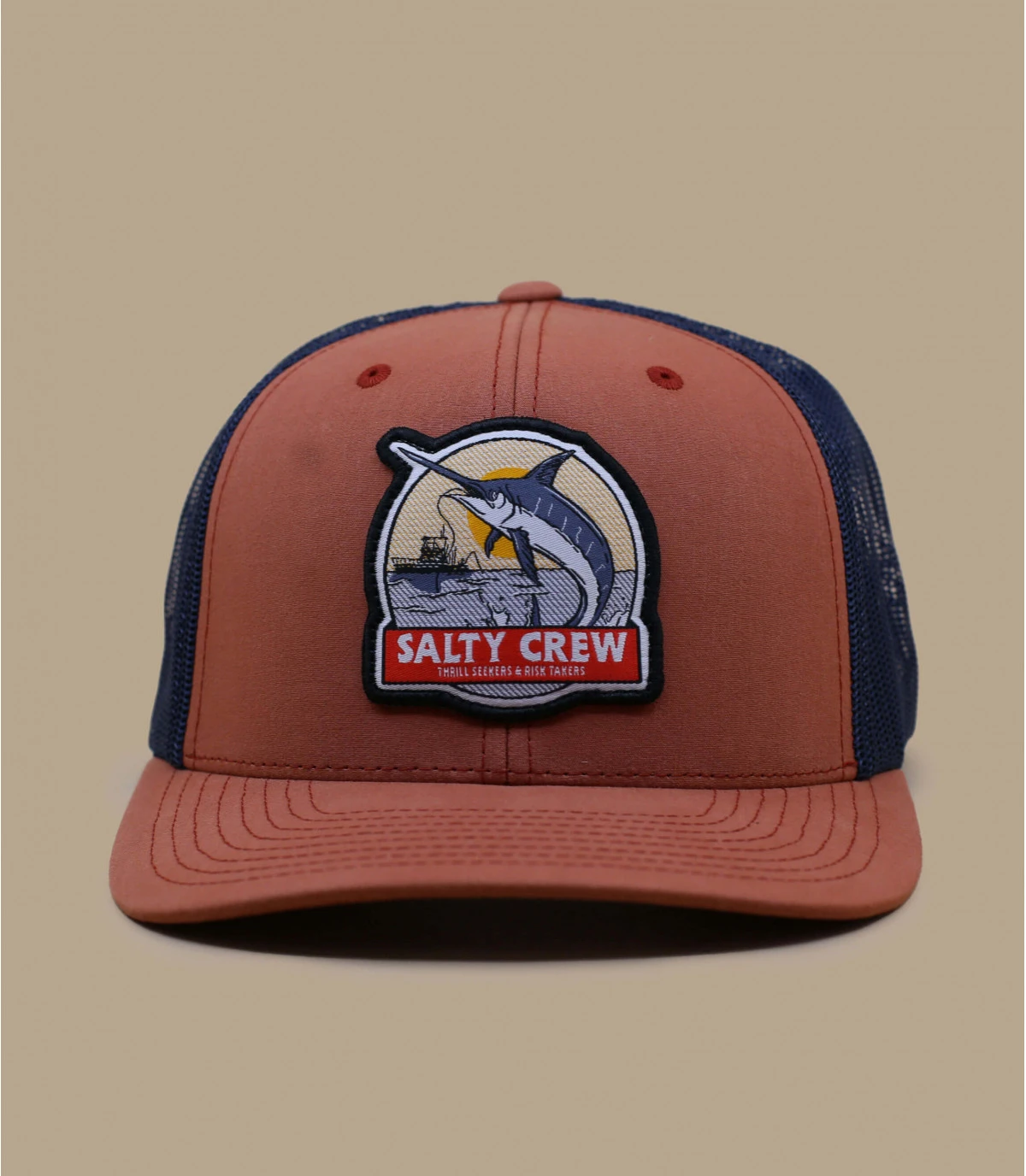 Affichez votre passion pour la pêche avec cette trucker de couleur rouille. Elle est légèrement délavée, le filet à l’arrière est noir. Un patch à l’avant montrant un espadon hors de l’eau pris à l’hameçon.