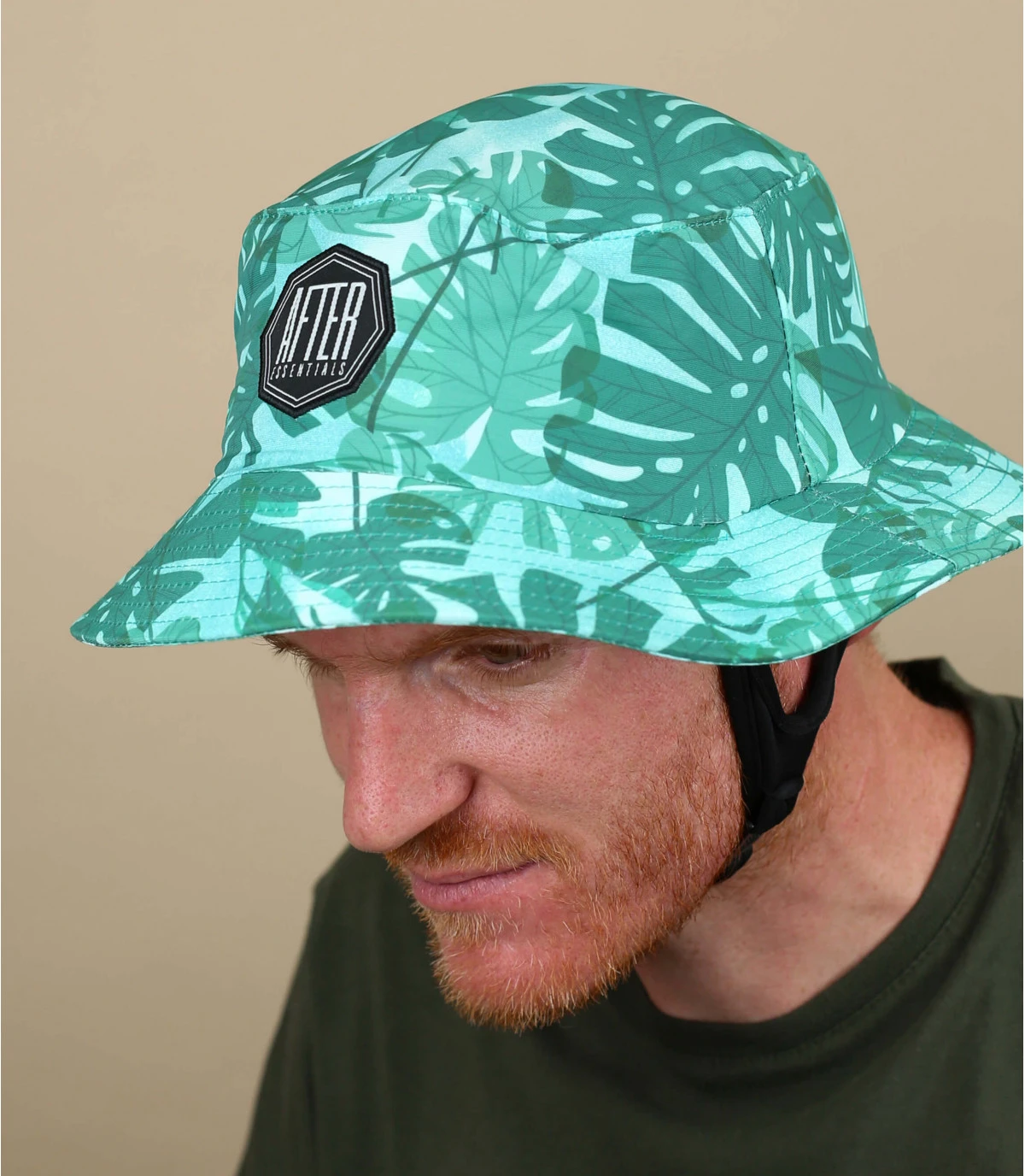 Restez au frais avec style grâce à ce bob orné d’un motif de grosses feuilles de palmiers vert et rafraîchissant. Il restera bien en place sur votre tête grâce à sa sangle de réglage. Son tissu est déperlant. Le patch avant montre la marque.